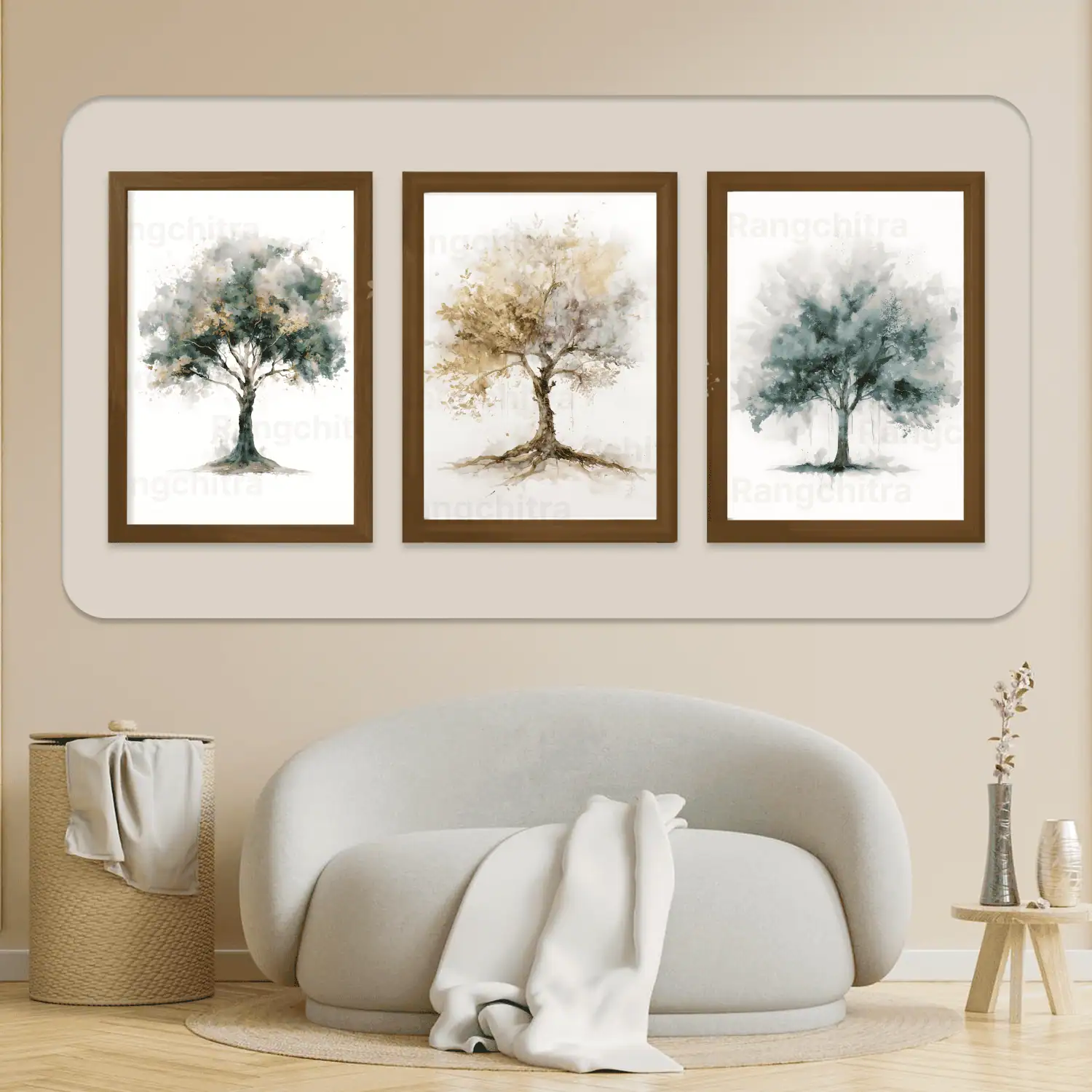 Bring the spirit of growth, abundance, and natural strength into your home with this stunning tree wall art set of 3, created exclusively by Rangchitra. Featuring three beautifully coordinated watercolor tree prints, each capturing a majestic single tree in soft, layered tones with delicate gold accents — this set makes it one of the most soulful tree wall art sets available online in India.